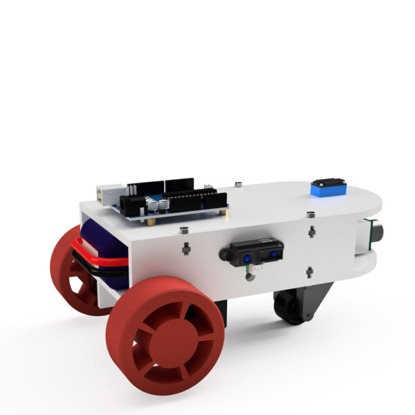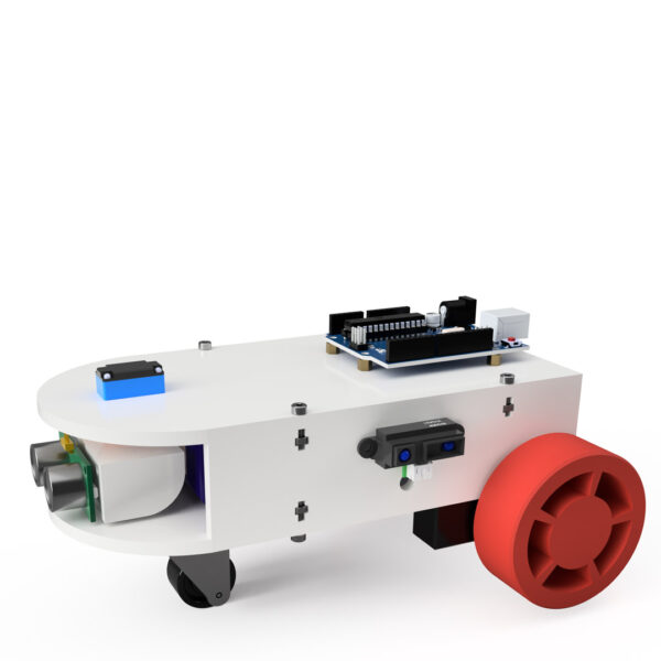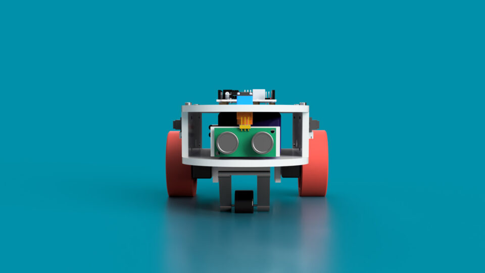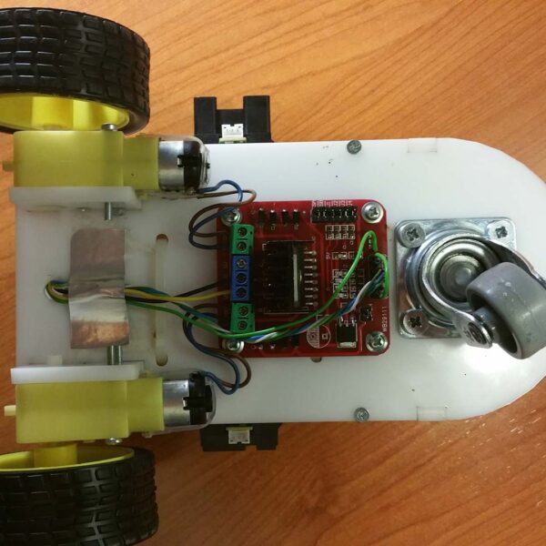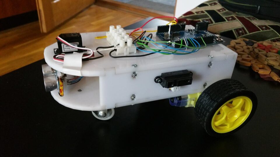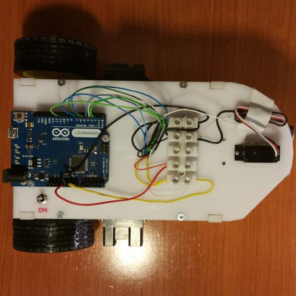 You can view in Figure 4 the TOP side of the robot where the Arduino board, some terminal strips, and the servomotor moving the ultrasonic sensor are placed. In Figure 5, on the BOTTOM side of the robot are visible the motor’s driver, the two motors, and a dummy wheel. Finally, in Figure 6 you can also notice the ultrasonic sensor placed at the front of the robot and an infrared one placed on the left side (accompanied by one more on the right side not visible in this figure).