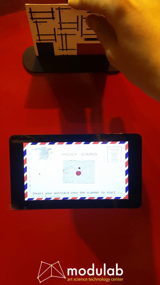 As you can see in Figure 1, the system was cased in a red wooden enclosure standing above the floor on a black metal pole (not included in this figure). On the front side of the e-mailbox there are located a thin slot for inserting the postcard to be scanned, a touchscreen display, and another slot for retrieving the postcard.
