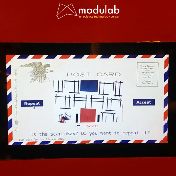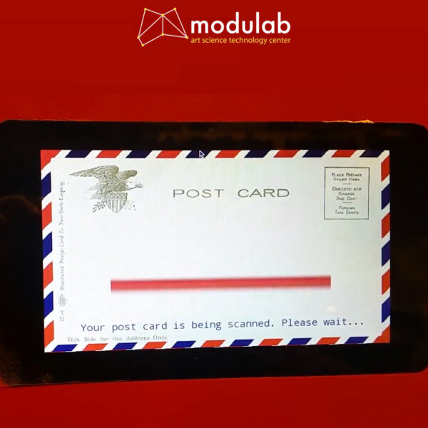 I will briefly present the software application that I developed using Python running on a small Rasberry Pi computer. As displayed in the following Figures 2 to 6 it was organized into 5 main stages, starting from an idle one. Transitioning to the second stage was performed immediately after the inserting of a postcard in the scanner’s slot. Once the scanning process was completed, the applications automatically moved to the third stage where the scan was previewed. Here is where the user had the option of accepting the scan or repeating it. Once the scan was accepted the user was asked to enter the sender’s email, a subject, and body for the email. Finally, in the final stage of the application, the email was sent.