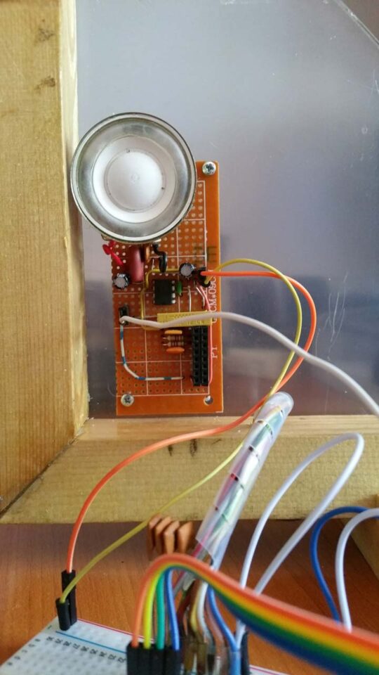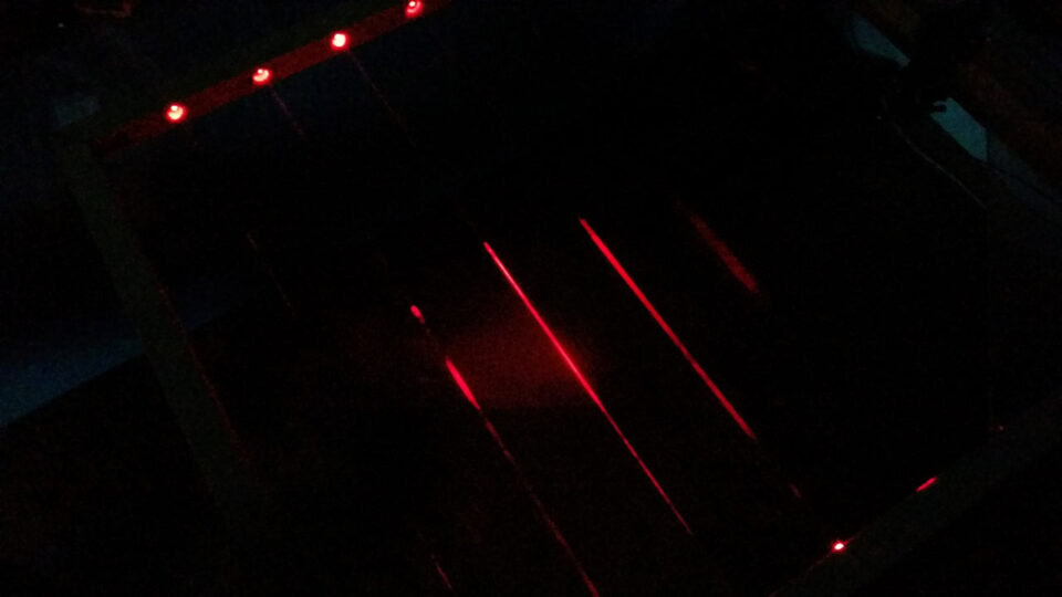 Displayed in Figure 2 are the laser strings visible in the dark. I used some laser diodes to emit the light signal and photoresistors in a voltage divider configuration to capture it. Also in Figure 3 you can observe the speaker of the whole system with the signal being fed from the microcontroller via a LM386 audio operational amplifier.