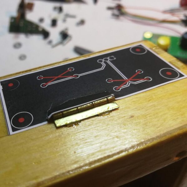 At the current time of development of this project, I didn’t have any knowledge in 3D Design, 3D printing, and Laser Cutting so I had once again to find a prototype way of fabricating an enclosure, as was also the case of Sequenster in the past. I decided to use a wooden box perfectly fitting the 8×32 dot-matrix display in which I carefully drilled holes for all 4 circuit boards usually using a paper template, as you can see in Figures 3 to 7. Finally, I covered the box with two matte black paint layers as displayed in Figure 8 and Figure 9.